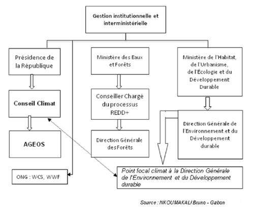 Le REDD au Gabon est sous la responsabilité du Point Focal du climat (à la CCNUCC) qui se tiendra à la Direction Générale de l'Environnement, qui dépend du Ministère de l'Habitat, de l'Urbanisme, de l'Ecologie et du Développement Durable. Ce point focal est responsable de l’exécution du programme pour les changements climatiques financés par le PNUD sur l'inventaire des gaz à effet de serre. Un autre acteur impliqué dans la gestion du REDD au Gabon est «Climate Council", sous la tutelle de la Présidence de la République.